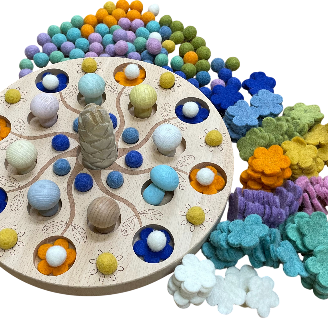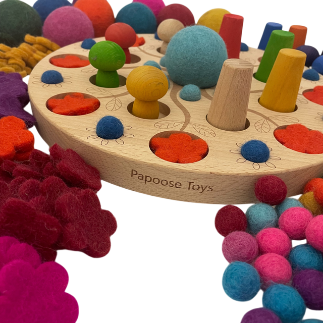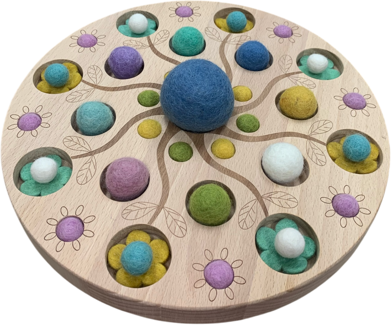 Encourage creativity, pattern making and fine motor development with this beautifully crafted Mandala Garden Board. Designed with a stunning engraved tree pattern and recessed spaces, this wooden board invites children to sort, match and arrange the colourful felt balls and flower pieces in endless combinations.